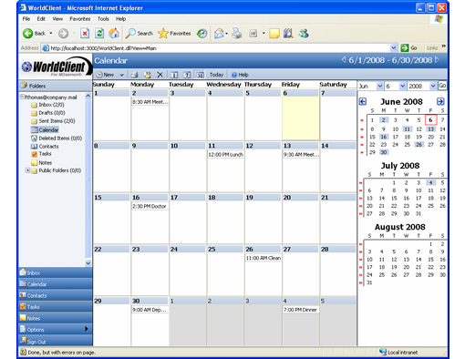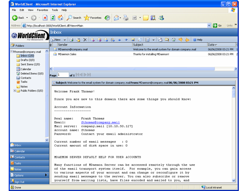 O WorldClient oferece serviços completos de webmail para lhe auxiliar a manter contato em seu escritório, de casa, em um cyber café ou nas dependências de algum cliente. Incluído gratuitamente em todas as versões do MDaemo, o WorldClient envia e recebe mensagens de qualquer computador conectado a internet, utilizando um navegador atualizado, como o Internet Explorer, Firefox, Opera e Safari. Ele pode ser acessado de computadores equipados com Windows, Mac OS X, e Linux.